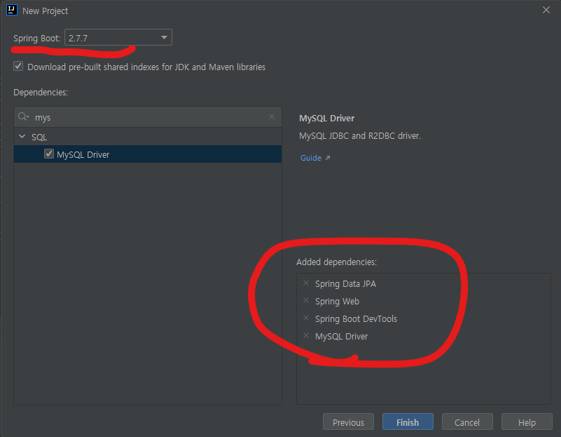 그리고 상단에 스프링부트 버전은 2.7.7 혹은 snapshot 버전은 피하도록하자